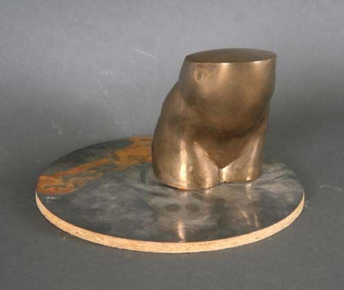 Drehbarer weiblicher Torso auf rundem Sockel aus Presspan mit Eisenblech, unter dem Sockel Adresse des Künstlers