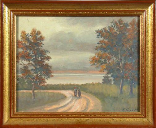 Herbstliche Partie an einem See, im Vordergrund zwei Bäuerinnen auf dem Uferweg
