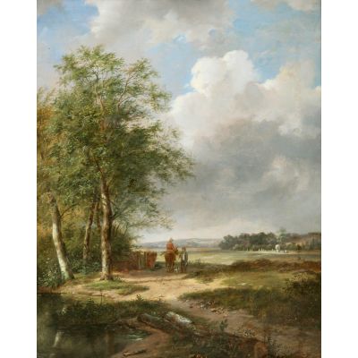 Ruiter en figuur aan de rand van het woud met mensen aan het werk in de verte