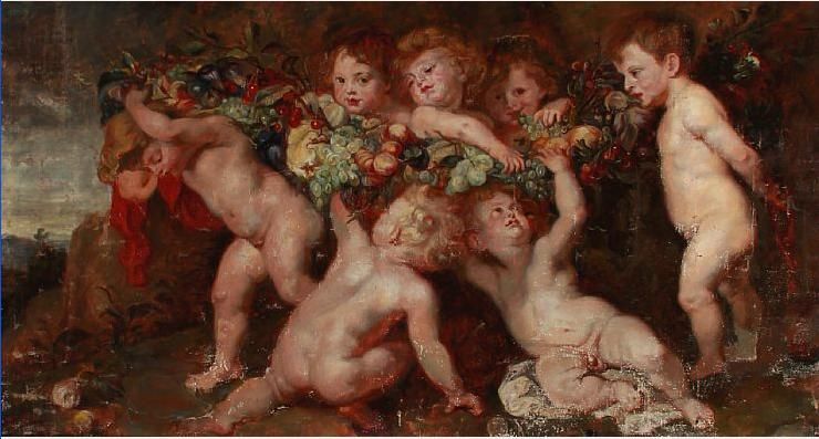 Putti playing with garland of fruit.
