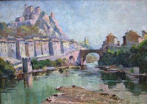 Hill top town with an arched bridge