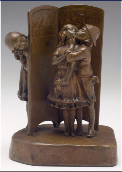 bronze with two children kissing behind a screen