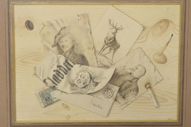 Tromp L'Oeil depicting a portrait of Rembrandt and other objects