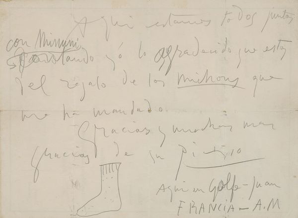| Carta manuscrita por Pablo Picasso, con pequeño dibujo. Firmada. París, c.1950. realizada a lápiz en el reverso de un menú de re | |