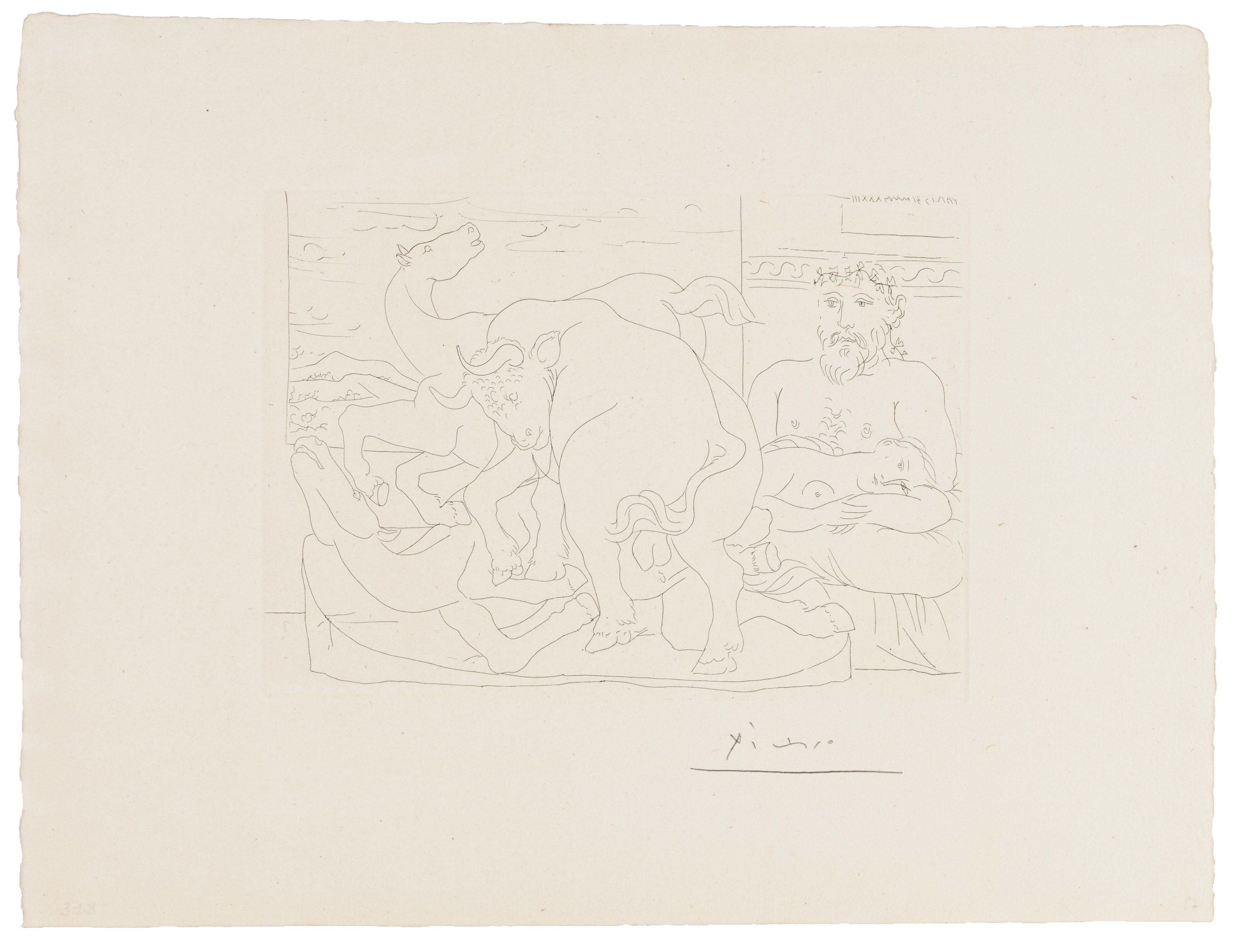 | Sculpteur et son modèle avec un groupe sculpté représentant un taureau attaquant des chevaux, from La Suite Vollard | |