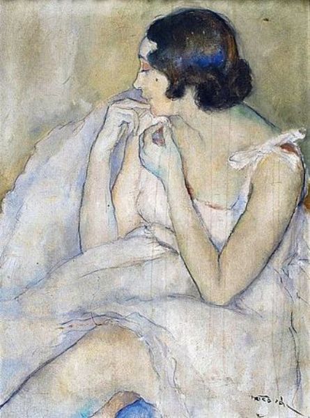 JEUNE FEMME ASSISE A LA ROBE BLANCHE.