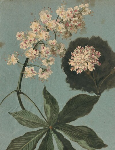 | Branche de fleurs de marronnier et oeillet blanc et rose | |