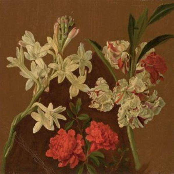| Jacinthe blanche, oeillets d'Inde rouges et autres fleurs (recto); Esquisse de bouquets de fleurs (verso) | |