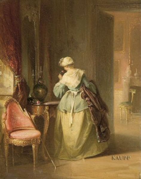 Boudoirszene mit Dienerin, an einer Rose riechend.