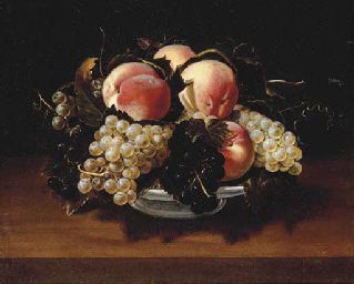 | Peaches and grapes in a glass bowl on a stone ledge with a wasp | |