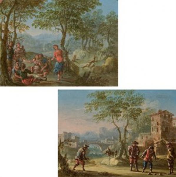 | Joueurs de boule sur la place du village; et Personnages déjeunant dans un paysage | |
