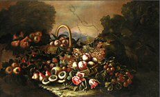 FRÜCHTE, BLÜTEN UND KORB VOR TIEFER LANDSCHAFT