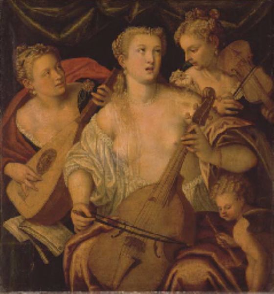 | A musical allegory: three ladies playing a viola da gamba, a lute and a viola da braccio, with a putto holding a shawm | |