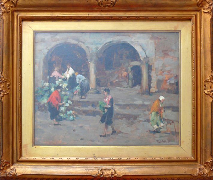 ''Blumenmarkt''; mehrere Frauen an einer Treppe vor Gebäude ihre Blumen verkaufend