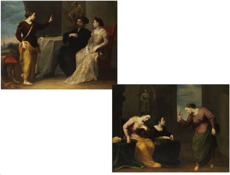 Gemäldepaar JUNGE WEIBLICHE HEILIGE SPRICHT ERMAHNEND ZU EINEM HÖFISCHEN PAAR
