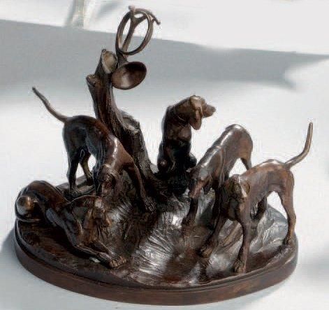 Relais de 5 chiens de meute auprès d'un arbre avec une trompe