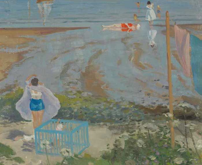 | WOMEN AND CHILDREN BATHING, WITH CHILD IN A PLAY-PEN IN THE FOREGROUND | |