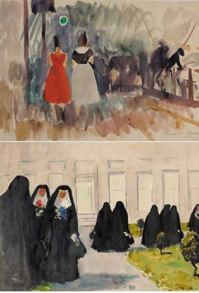 | WOMEN AND FISHERMEN ON DOLLYMOUNT PIER, 1954 and NUNS IN A GARDEN, 1955 (A PAIR) | |