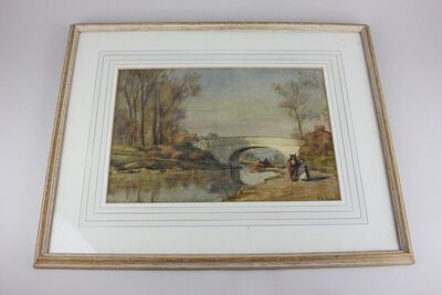 | Figure leading a horse beside a river, boat passing beneath a bridge flanked by buildings and trees | |