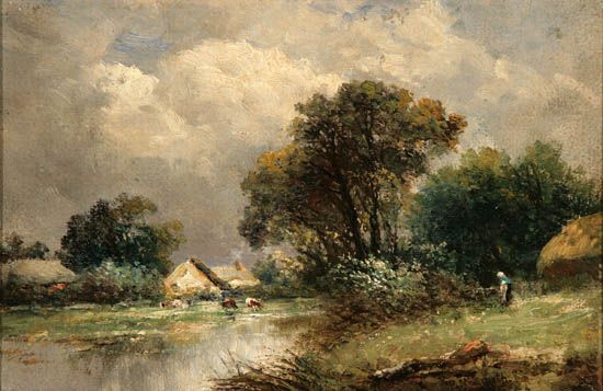 Rural Landscape with Cottage and Cows Watering