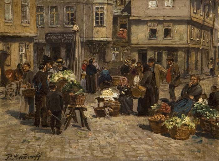 Altmarkt in Hanau, vielfigurige Szene mit Gemüsemarkt