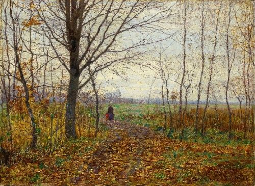 | BLICK AUS WALDRAND AUF VORFRÜHLINGSWIESEN, MIT FRAU UND KIND, DIE AUS DEM WALD GEHEN | |