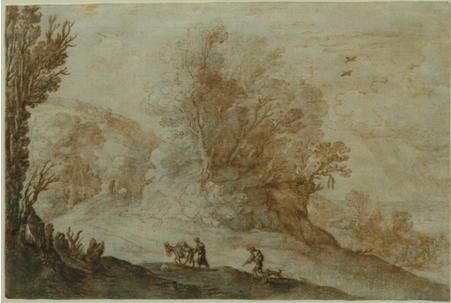 Travelers on a Road in a Hilly Wooded Landscape, a Church Beyond