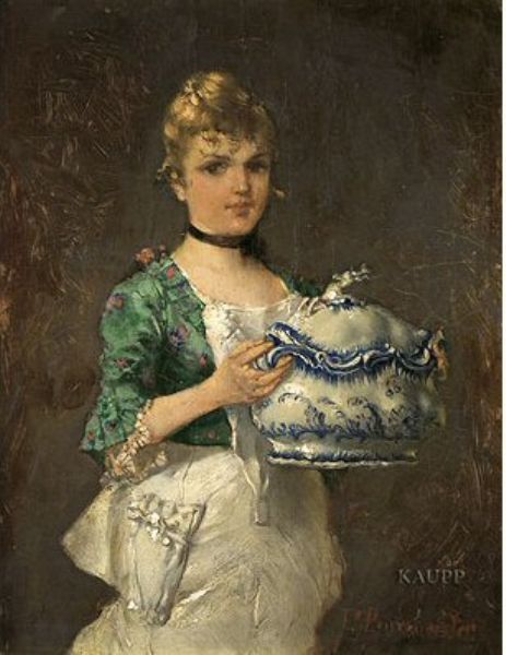 Junges Mädchen mit hochgestecktem blondem Haar, eine Terrine tragend