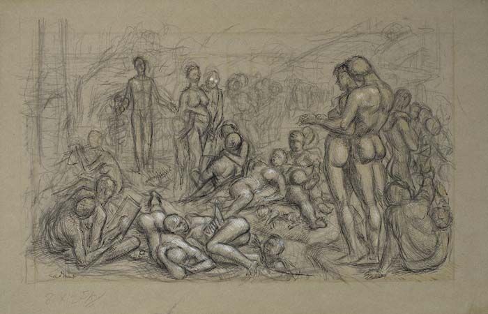 | Pen and black and brown ink over pencil with white gouache heightening on grayish-buff laid paper, circa 1947 | |