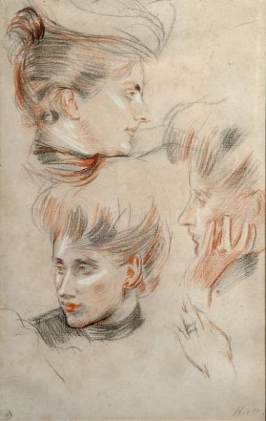 | Portrait d'Alice Helleu de face et de profil, portrait de profil de Madame Clarigny à gauche et d'une main Crayon noir | |