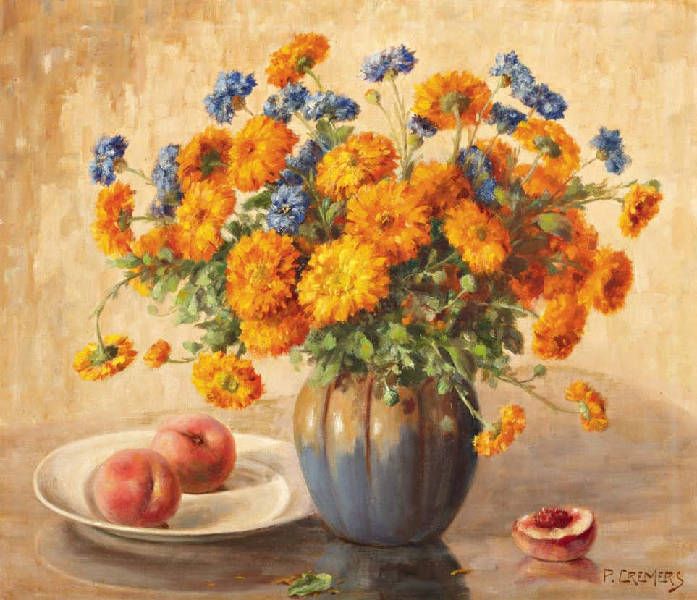 Stilleven met perziken en chrysanten