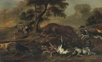 | Hounds attacking a deer in a hilly landscape, a hunters couple on horseback nearby | |