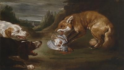 Two hounds chasing a fox with a dead partridge