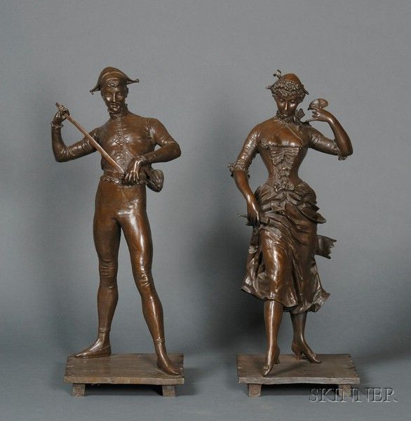 Pair of Large Bronze Commedia dell'Arte Figures of Columbine and Harlequin