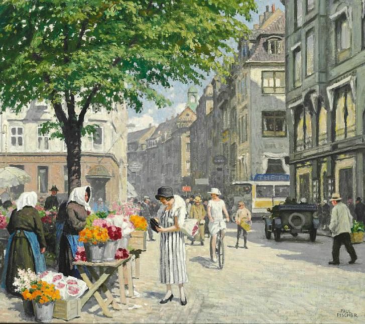 | Flower market at Højbro Plads in Copenhagen with an elegant lady in a striped dress. | |