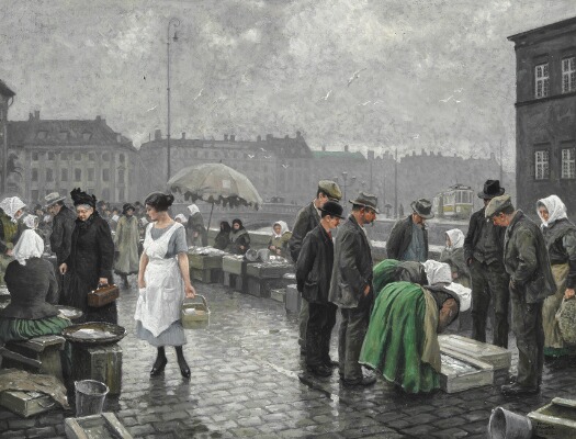 Gammel Strand in Copenhagen. A maid is buying fresh fish