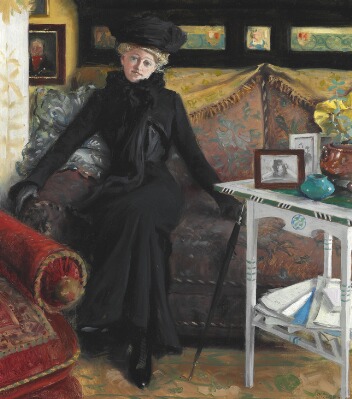 The actress Oda Nielsen dressed in black sitting in the artist's living room at Sofievej
