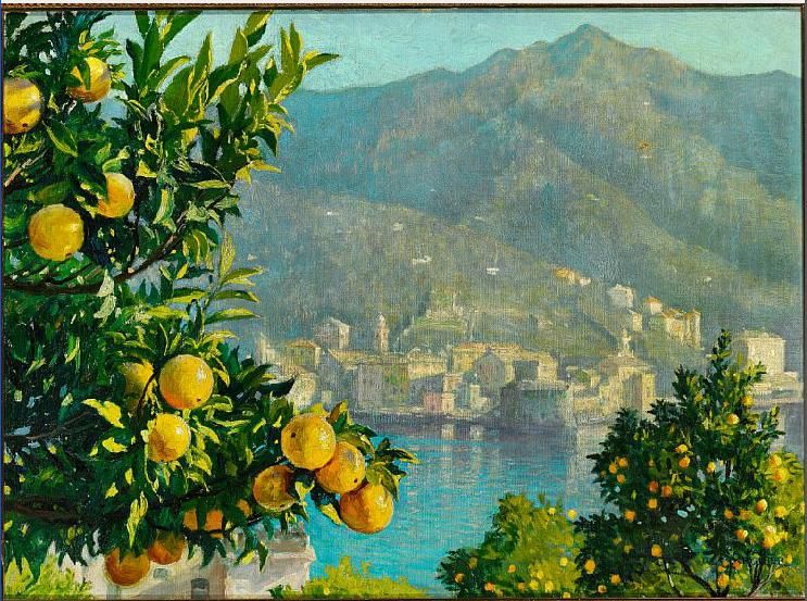 View of Amalfi with orange trees.