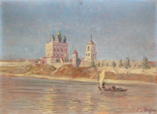 | Blick auf die Dreifaltigkeitskathedrale und den Kreml von Pskow (Pleskau). | |