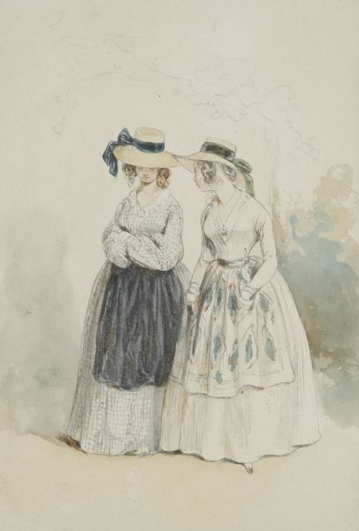 Deux promeneuses portant des tabliers et des chapeaux à rubans