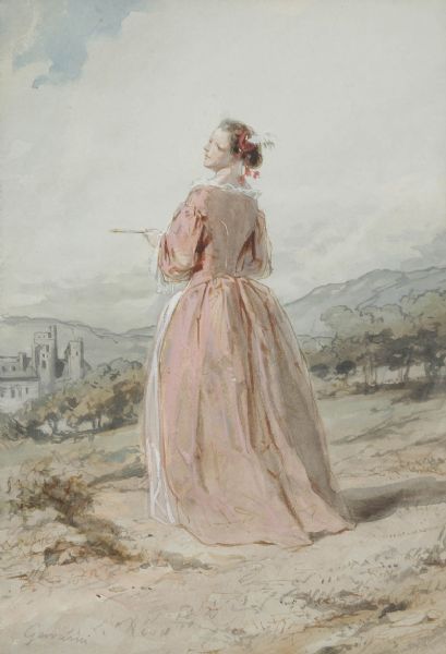 Jeune femme en robe rose dans un paysage avec un château