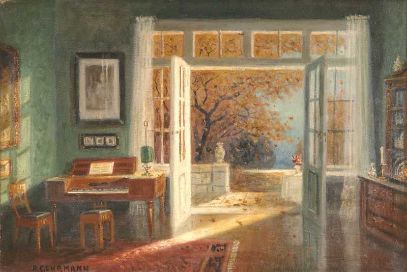 Interieur mit Biedermeiereinrichtung und Blick auf Terasse