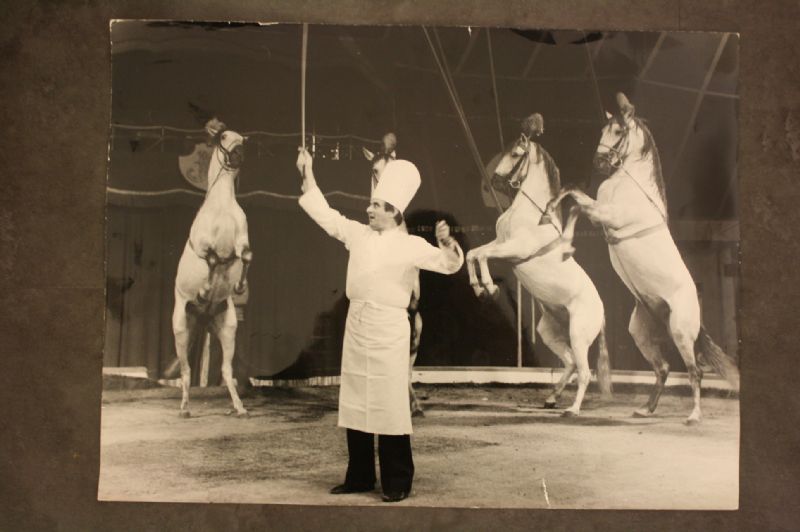 Paul Bocuse effectuant un numéro de dressage équestre dans un cirque, vers 1960