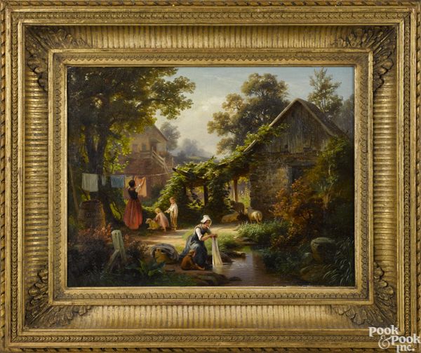 | landscape with women and children doing laundry with a barn and sheep in the background | |