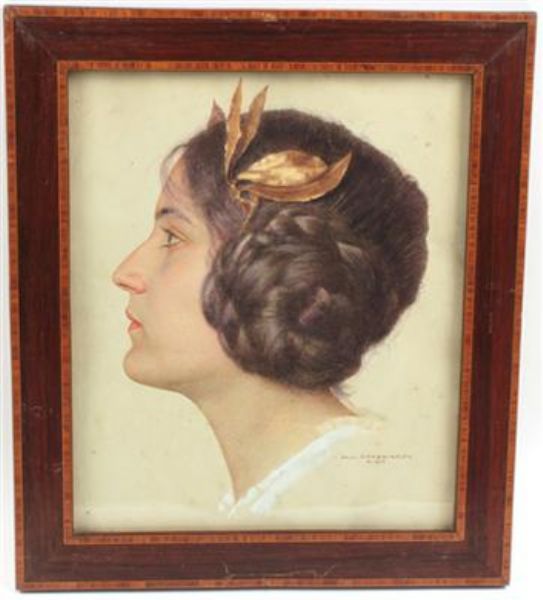 | A portrait of a girl in profile towards left, golden laurel in her hair | |