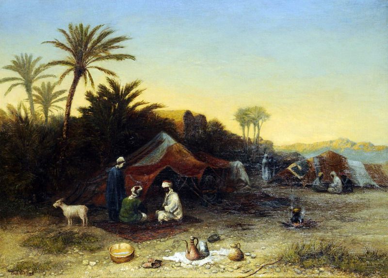 | Algerian encampment at dusk, with figures seated beside tents surrounding a fire, before Atlas mountains beyond | |