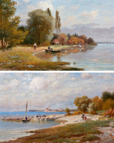 | The banks of the Bodensee with a viewof a town and Bodensee with fishing boat in the foreground | |