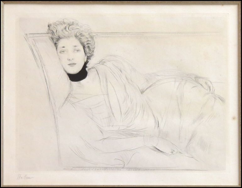 JEUNE FEMME ALLONGEE SUR UN CANAPE.