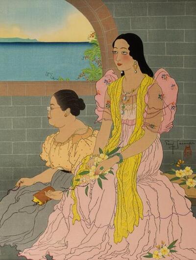 | Estampe polychrome représentant une jeune fille en robe de fête assise aux côtés de sa mère auprès d’une ouverture donnant sur l | |