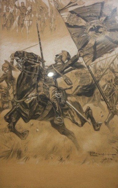 | Charge de cuirassiers ramenant drapeaux prussiens, allégorie dans un angle avec Empereur Napoléon Ier | |